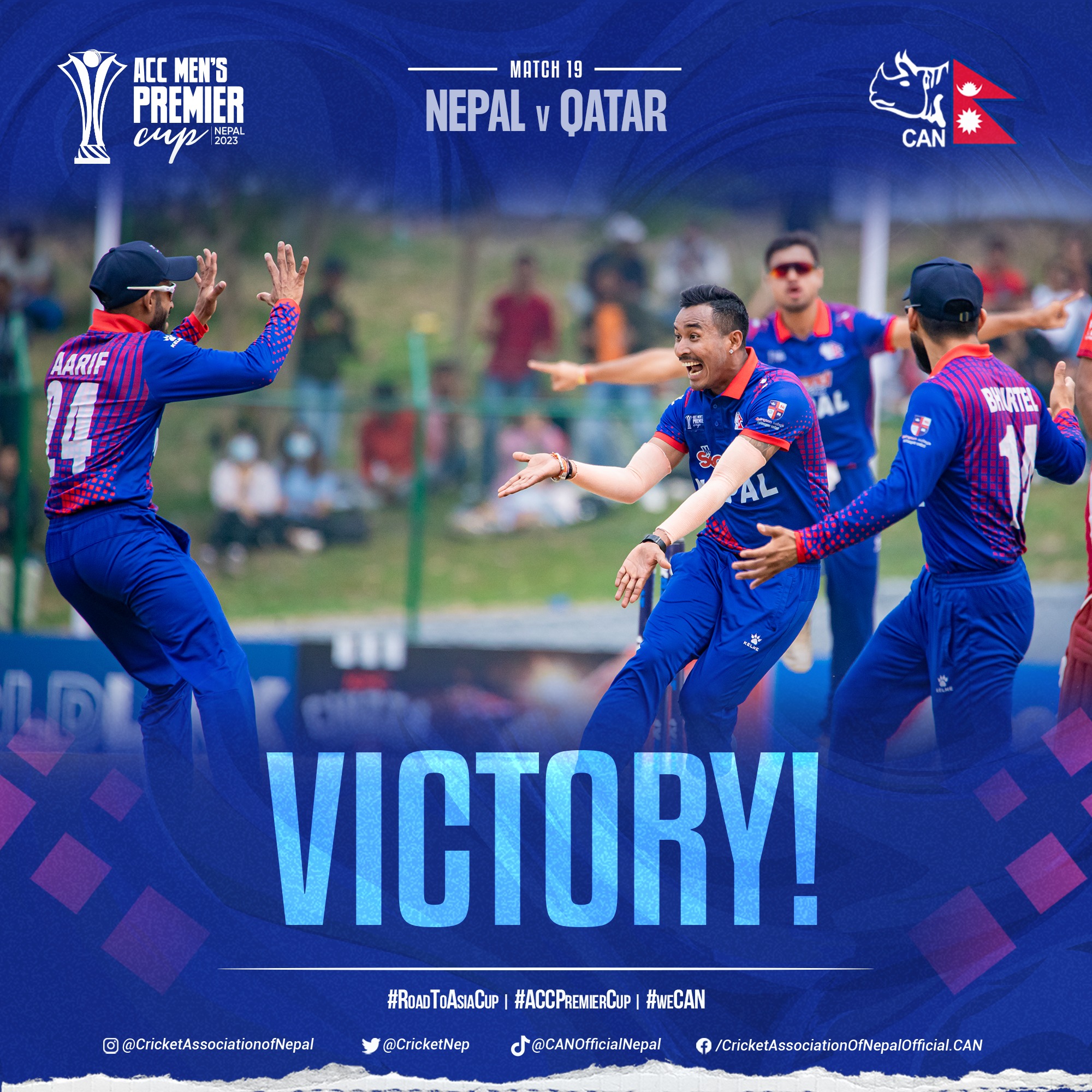 एसीसी प्रिमियर कपको समूह चरण अन्तर्गत समूह ए को अन्तिम खेलमा नेपालले कतारलाई ६८ रनले पराजित गरेको छ। टियु क्रिकेट मैदानमा भएको खेलमा कतारले नेपाललाई १५८ रनको लक्ष्य दिएको थियो। नेपालले लक्ष्य पछ्याउने क्रममा कतारलाई ८९ रनमा रोक्दै जित हासिल गरेको हो।